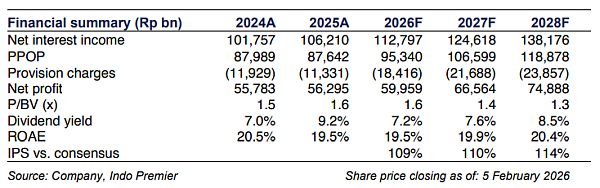 recorded net profit of Rp56.3tr in FY25 (+1% yoy/+40% qoq in 4Q25); in-line with ours but above consensus FY25F estimates at 101/110% which we have highlighted in our previous note (link). PPOP came flat yoy (+22% qoq) from solid non-II (+9% yoy/+23% qoq - largely due to recovery) and decent NII (+4% yoy). CIR improved to 43.5% vs. 44.6% in 3Q25 and it guides for normalizing CIR at 42-43% in FY26F. Provision eased -5% yoy (-73% qoq) which translates to lower CoC of 58bp (-21bp yoy/-15bp qoq), far behind its guidance of 80-100bp in FY25F. It guides for CoC of 60-80bp in FY26F.