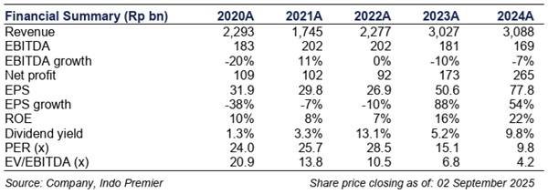 Per 1H25, tidak memiliki utang dengan posisi kas Rp1 triliun. Selama 15 tahun terakhir, perusahaan telah mempertahankan rasio pembayaran dividen tinggi, setidaknya 60-70% atau lebih. Saat ini, sahamnya diperdagangkan di 7,6x P/E forward 12M berdasarkan konsensus Bloomberg (-1 di bawah std. LT mean). ( Riset IndoPremier )