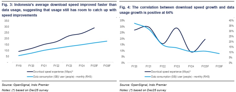 We upgrade our FY26F aggregate EBITDA estimate by 3%, now forecasting 7% yoy growth (vs. 5% previously), driven by improving mobile ARPU amid a tad stronger household consumption (5.2% yoy in FY26F vs. 5.0% in FY25F), faster data usage growth and better data yield. Meanwhile, FTTH growth remains muted. Through 9M25, average monthly mobile data usage rose 11% yoy - 3% above our prior estimate, supported by improving network performance (download speeds of 28.5 Mbps, +22% yoy as of Dec25). In FY26F, we expect data usage growth of 9% yoy with data yield improving but still declining by 2% yoy. Overall, we raise our FY25-27F EBITDA estimates by 1-3%, lifting the sector's FY24-27F EBITDA CAGR to 4% (from 3%), with EBITDA margins gradually improving from 48% in FY25F to 50% in FY27F.